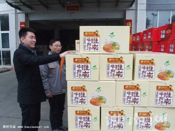 2月下旬,農歷正月里,淮河早報、淮南網記者來到位于淮南市安成經濟開發區的宜生食品公司,正是一片忙碌的景象。大門口,一輛大貨車正在裝貨,由庫房運出的一箱箱淮南牛肉湯由叉車搬運到車上,車上2名工人將箱包碼好堆放整齊。其間,還有公司生產的牛肉板面、酸辣粉等其它方便食品也同時裝載上車,這是經銷商同時配的貨。