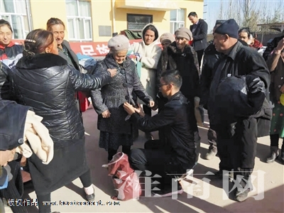 伽師縣政法委派駐歐吐拉英買里村“訪惠聚”工作隊副隊長周啟龍告訴淮河早報、淮南網(wǎng)記者:“我們特意選擇在星期一‘升國旗、宣講教育群眾’活動日這天舉行棉衣發(fā)放儀式。發(fā)放之前,我們先給群眾宣講了淮南人民對我們的關(guān)愛,特別強調(diào)了陳斌老師、崔琴老師等淮南一批組織者的名字,讓群眾記住這些閃耀著愛心光芒的人名,向群眾講解了衣服的來源和意義,讓他們明白這種血濃于水的情誼何等珍貴。宣講結(jié)束后,我們組織群眾挑選適合自己的衣服,我和米爾阿力木拍了一些現(xiàn)場照片,我們想讓更多的人知道淮南人民的這份大愛已經(jīng)溫暖了這片熱土和邊疆人民的心房。”