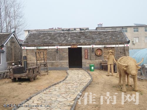 村邊小河,流水清澈;岸旁橋邊,柳條依依。沿路來到村部后的文化廣場,矗立著“三頭牛”的大紅文化壁像,號召人們發揚為民服務“孺子!、創新發展“拓荒!、艱苦奮斗“老黃!钡木。特別在此地設立“三牛廣場”,倡導“三頭!本瘢且驗殚Z湖村曾是當年興修茨淮新河時的工程建設指揮部所在地。在當時生產力十分落后的情況下,正是沿岸人民吃苦耐勞、持續奮戰,才建成淮北平原最長的人工河,至今造福兩岸人民,生動闡釋著“老黃!本瘛