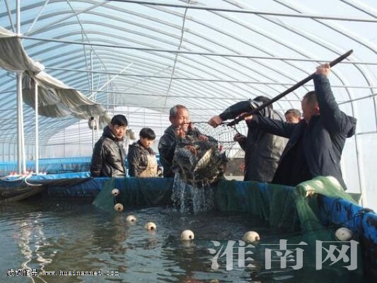 1月中旬,得知馭風水產合作社第二天要進行“圈桶”起魚作業,魚產品將銷往蚌埠。次日一早,淮河早報、淮南網記者即趕往養殖基地。基地位于高塘湖西側,在大通區上窯鎮馬廟村東南處。其中,傳統養殖區有300多畝大水面和200多畝的池塘,傳統養殖區南岸即是“圈桶養魚”區,有一處大棚,棚內有4只大“圈桶”,社員們正在起魚。只見社員們將“圈桶”內提前圍好集中的魚撈出,再進行分揀。這次是鯉魚,大些規格的魚將運走上市,小些達不到規格就放入露天池塘里繼續養殖。棚外,正停著一輛運輸活魚的貨車,上面要帶著氣瓶供氧。開車的經銷商說,年節市場正需求碗頭魚,斤把重的鯉魚正合適,市場價在每斤4、5塊錢。
