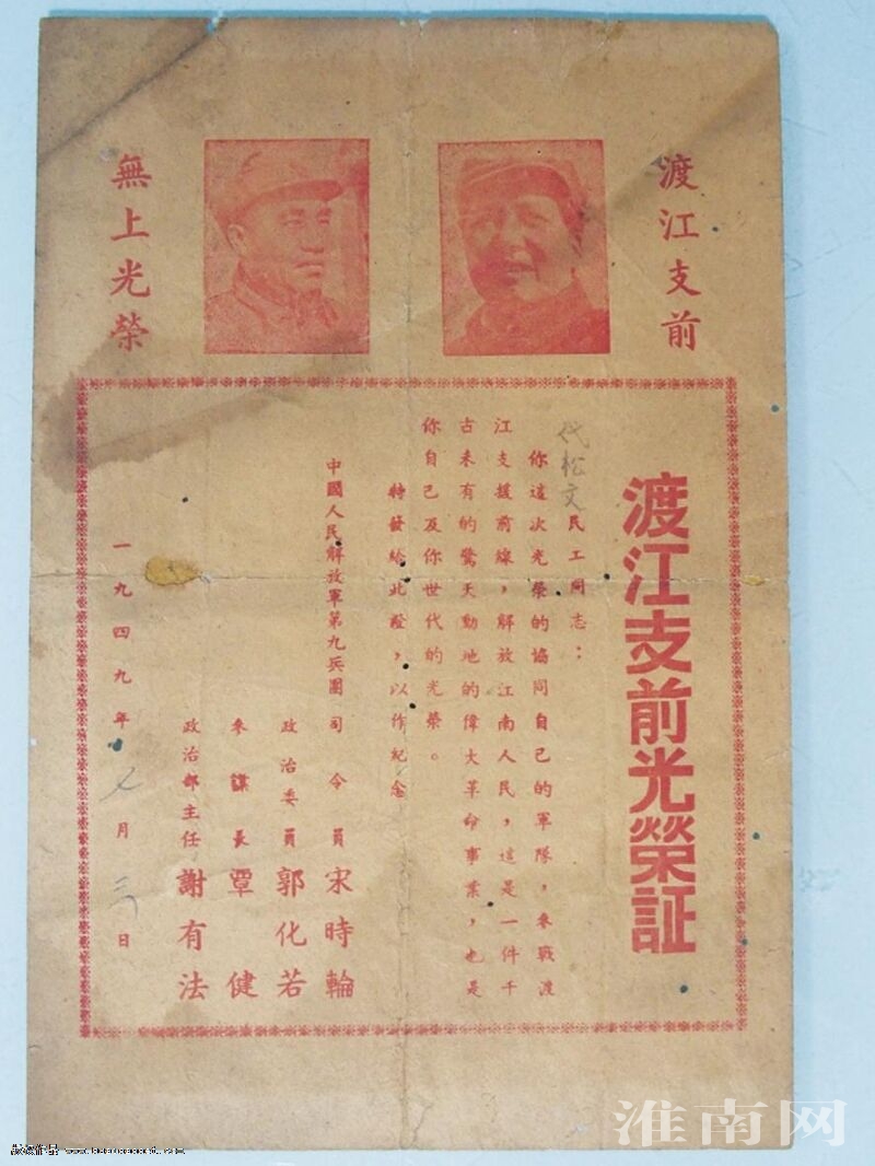 此外,這組主題藏品中還有一張《渡江支前光榮證》,上方印著毛澤東主席和朱德總司令的頭像,頭像兩邊寫著“渡江支前,無上光榮”八個大字。這張《光榮證》是發給一名叫代松文的民工的,是由中國人民解放軍第九兵團頒發的,有兵團司令宋時輪及政委、參謀長及政治部主任4人的簽章!豆鈽s證》上對這位民工同志寫道:“你這次光榮地協同自己的軍隊,參戰渡江支援前線,解放江南人民,這是一件千古未有的驚天動地的偉大革命事業,也是你自己及你世代的光榮。特發給此證,以作紀念!