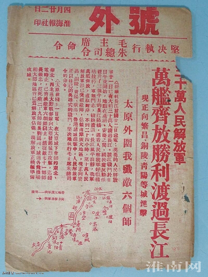 這些主題藏品中,最典型的當屬“渡江戰役”期間《淮海報社》印制的《號外》——《三十萬人民解放軍 萬艦齊放勝利渡過長江》,內里則刊有中國人民革命軍事委員會主席毛澤東、中國人民解放軍總司令朱德,聯名發布的《向全國進軍的命令》,命令人民解放軍“奮勇前進,堅決、徹底、干凈、全部地殲滅中國境內一切敢于抵抗的國民黨反動派,解放全國人民,保衛中國領土主權的獨立和完整。”