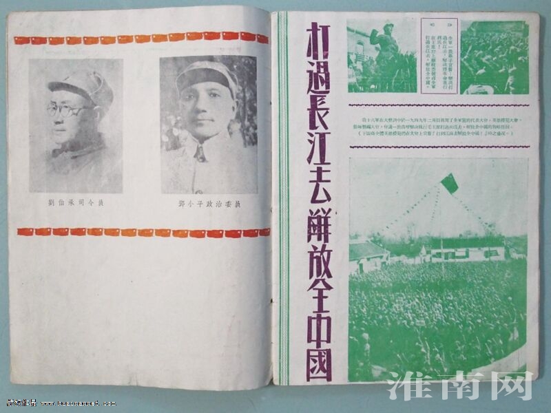 在“渡江戰役”主題藏品中,這本《勇士畫冊》難得一見。畫冊封面是一張解放軍戰士正在渡江的新聞照片,并附有兩行文字:“數百只船舟向長江南岸駛去,無數挺機槍向對岸敵人射擊!碑媰杂芍袊嗣窠夥跑姷谑娬尾砍霭,沒有具體出版日期,依內容推斷是在“渡江戰役”剛勝利不久。畫冊在毛澤東、朱德及劉伯承、鄧小平照片之后,頭條通版標題便是“打過長江去,解放全中國!”這也是畫冊的主題。