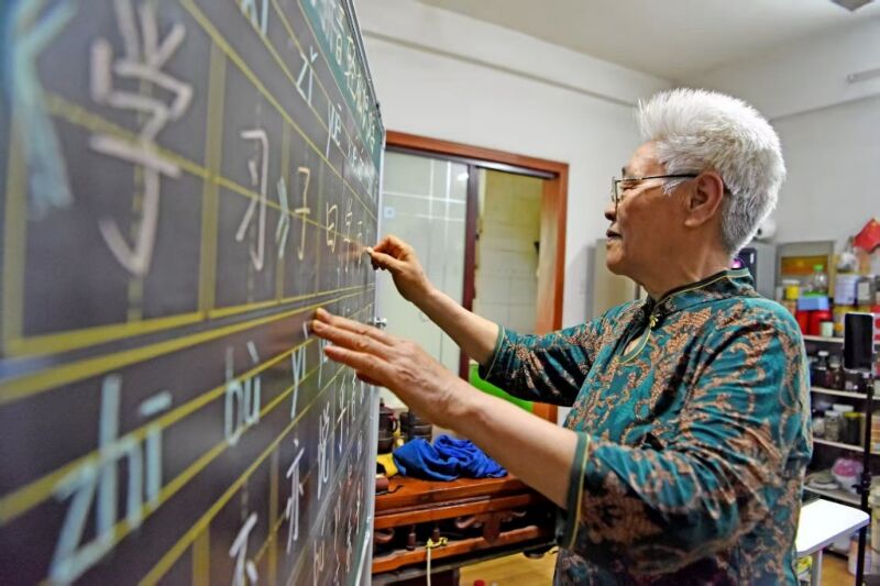 “當時看到很多年輕人玩短視頻,我就想,能不能用這個教拼音?”楊維云撫摸著陪伴她多年的小黑板說。起初,一個簡單的教學視頻要反復錄制幾十遍,“眼睛老花看不清手機,手指也不靈活,但想到可能有人需要,就堅持下來了”。