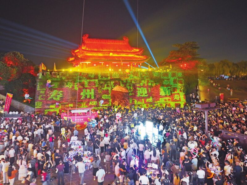國(guó)慶中秋假期,壽縣古城文旅活動(dòng)精彩紛呈。10月7日晚,壽縣賓陽門古城墻光影秀璀璨亮相,楚文化故事如畫卷般鋪展于宋代城磚之上,楚風(fēng)紋樣在燈光映襯下靈動(dòng)流轉(zhuǎn),以沉浸式的體驗(yàn)方式,揭開“一城人文典故,千年魅力楚都”的浪漫篇章。