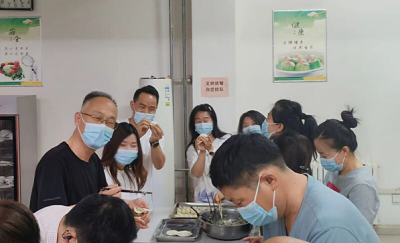 孫金乙(左一)帶領(lǐng)教師們一起包餃子