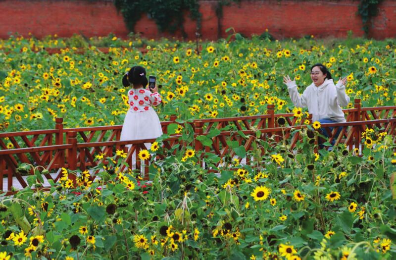 寒露時節,大部分花卉已褪去了絢麗的色澤,壽縣古城香草小鎮院內,矮生多頭向日葵——菊芋依然展露笑顏,熱情地迎接著每一位游人。