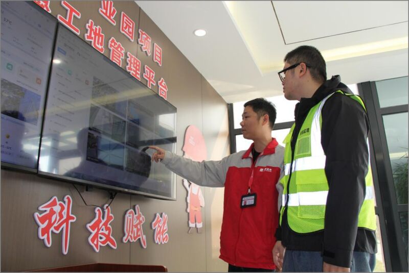 在項目部智慧工地管理平臺,記者看到,大屏上清晰顯示“今日考勤數345人”,18個在線攝像頭實時查看各重點作業面施工情況。施工方現場負責人告訴記者:“施工人數最多時達到460人,現場配備6臺塔吊、4臺物料提升機,并與專業機械租賃單位簽訂24小時運轉協議,保障垂直運輸需求。”