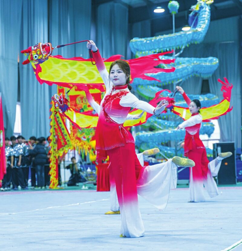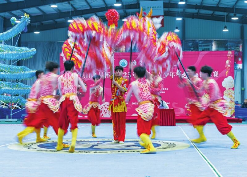 12月20日下午,淮南師范學院小球館內熱鬧非凡,金黃的長龍盤旋升空,紅鬃醒獅踩點跳躍,一群又一群青少年手擎道具默契配合,一招一式剛勁靈動,贏得觀眾陣陣喝彩。
