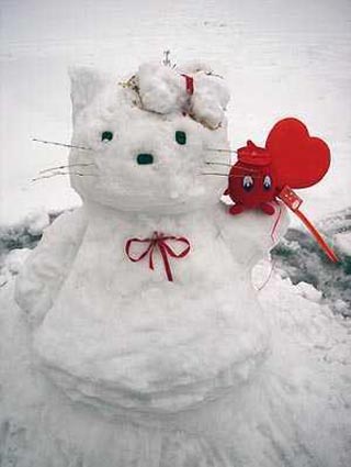 不知從什么時候起,雪人已經超越了從前古板的套路,不再是兩個眼睛一個鼻子,酷似可愛小人的造型了,而是形狀百變。1月10日,記者在網上看到,一個淮南的網民朋友將自己在2009年第一場雪時堆出的雪人傳到了網上,原來是一個大大的“史努比”,可愛的小狗非常逼真,不特別仔細看還真以為是一個雪白的毛絨玩具呢。這位網友介紹說,“老是堆那種胳膊直直的,脖子也直直的雪人多沒勁啊,自己創新才有意思呢。”不久就不斷有人跟帖將自己以前和最近堆出的雪人照片也放在網上了,有一直很流行的“招財貓”造型的雪人,瞇瞇的眼睛,咧著的嘴巴,還有標志性的微微舉起的胳膊,這個“創新雪人”的造型引來了網友們的一致贊揚。另外有孩子們都很喜愛的叫hellokitty的小貓的雪人,世博會吉祥物海寶的雪人……一個個形象逼真,形態各異。