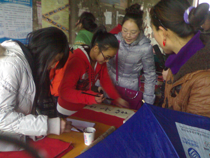 圖:朱潔琛新年之時(shí)與同門(mén)師兄妹們一起義寫(xiě)春聯(lián)(左二)