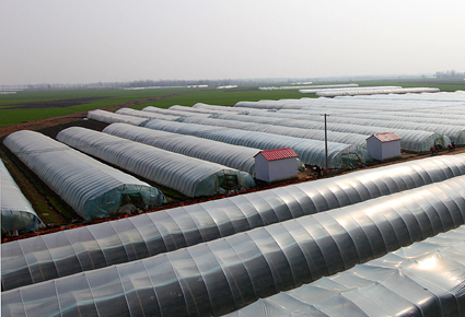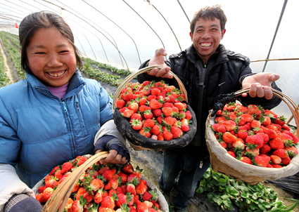 圖一:瞧,咱種植的草莓大又甜。 圖二:農戶在采摘草莓運往各地。 圖三:鱗次櫛比的草莓大棚。