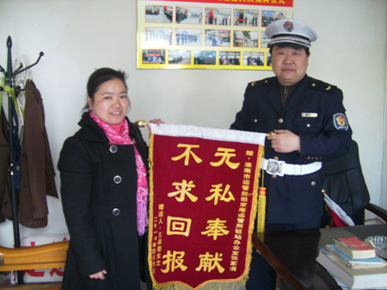 為了能讓王翠榮安心返程,駐站辦的工作人員一方面同市運(yùn)管處96333取得聯(lián)系,查詢出租車票據(jù)來源,一方面調(diào)出王翠榮乘車到長途汽車站時段內(nèi)的監(jiān)控錄像。發(fā)現(xiàn)她乘坐的是鑫皇公司的出租車后,駐站辦的工作人員與該公司取得了聯(lián)系。在該公司的配合下,于當(dāng)日下午4時許將王翠榮遺忘在出租車內(nèi)的包送還給她。找到包的王翠榮破涕為笑,向幫助她的人一再表示感謝。近日,一面“不求回報,無私奉獻(xiàn)”的錦旗由王翠榮親手送到了駐站辦。