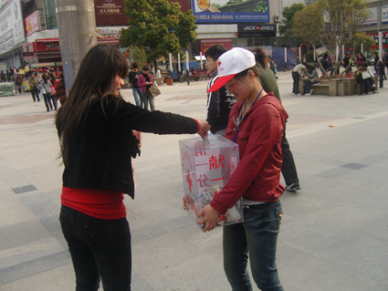 4月17日下午,淮南市龍湖路商貿文化廣場,幾個女孩子正在以淮南市紅十字會志愿者的名義為青海玉樹災區募捐……