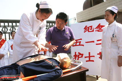 “首先要將病人仰臥于硬板床或地面上,頭部與心臟在同一水平線……打開氣道,口對口呼吸時要把整個嘴包住,不能漏氣。人工呼吸兩次后,就可以在雙乳中間點進行按壓了,注意按壓的勁兒不要使太大。”護士們邊演示邊講解,現場市民看后是躍躍欲試。