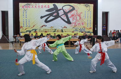 5月15日,安徽理工大學第9屆大學生校園武術大賽在該校大學生活動中心舉行。來自該校9個學院代表隊的近200名大學生選手參加了南拳、長拳、太極拳、女子劍術、男子刀術、雙截棍、散打、跆拳道和集體項目組別的比賽。賽場上,選手們使盡渾身解術,分別亮出真功夫,空中翻越、劈叉飛鴻等高難度動作贏得了觀眾陣陣掌聲。