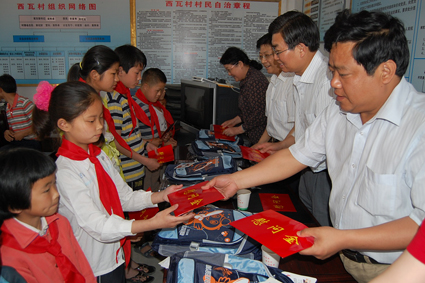 當日下午,在西瓦村,15戶孤兒、單親家庭兒童、殘疾兒童家庭分別獲得了市教育局工會贈送的各200元的慰問金和書包、文具等學習用品。與此同時,在村居住的20名五保戶和80歲以上老黨員也收到了工會發放的米、油慰問品。