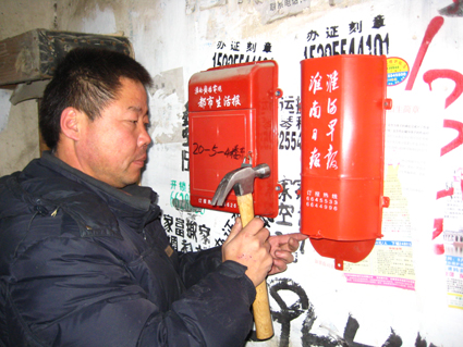 圖:黃永平正在一家居民樓下釘報箱