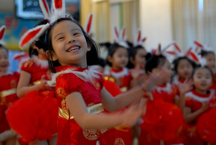 圖為小朋友裝扮成小白兔喜迎農(nóng)歷兔年的到來。