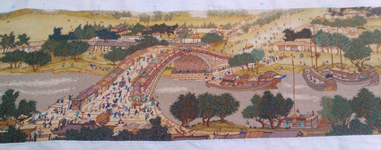一針一線總關情,一筆一劃亦有意,俯瞰整幅刺繡,一種自然的生活氣息便撲面而來,彎彎的拱橋上人來人往,漁民劃著船槳賣著農貨,高高的酒樓朋客滿座,波光粼粼的水面泛著晶瑩的光,岸邊的柳樹搖曳著身姿。宋代的張擇端用自己的畫筆描繪著生活的繁榮與富足,而羅女士則用手中的繡針表現這個時代的圖畫,家鄉變美了,生活更好了,同樣的畫卷,不同的時代,卻是同樣的心情。“我就是想用這幅畫來表現現在的生活,時代在進步,我們很知足。”羅文勤女士說道。
