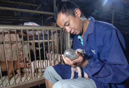 鳳臺縣楊村鄉店集村“村官”劉昶,2006年畢業于華東政法學院經濟系金融專業,畢業后曾在上海浦東一家企業就業,一年后他毅然選擇了回鄉自主創業。他在家鄉干起了養豬事業,一開始養了8頭母豬,現已發展到53頭母豬,肥豬年出欄量達500多頭,年純收入近20萬元,在自己得到發展致富的基礎上,他又帶動鄰村周邊農戶養豬,為村民提供飼料及技術指導一起致富,在今年的換屆選舉中,他被大家選為村支兩委委員。圖為9月2日劉昶在精心呵護小仔豬時的情景。