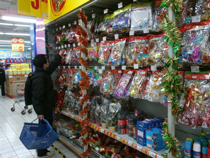圖為:在某大型超市內(nèi),消費(fèi)者正在選購(gòu)圣誕商品。