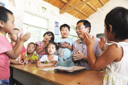 “小朋友們,請把昨天布置的作業(yè)在課堂上完成。一年級的同學(xué),我們今天學(xué)習(xí)漢語拼音ɑ、o、e……”說話間,花學(xué)剛用手掠了掠眼鏡的鏡框,然后津津有味地上起了語文課。9時10分,花學(xué)剛給一年級學(xué)生布置好課堂作業(yè),然后拿起《學(xué)前語言讀本》,與9位學(xué)前兒童一道學(xué)習(xí)起來。這種上半節(jié)課教授一年級知識,下半節(jié)課教授學(xué)前知識的復(fù)式班教學(xué)法,是花學(xué)剛30年前研發(fā)的,并且教學(xué)效果一直很好。