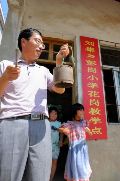 15年前,花學(xué)剛將教學(xué)點的口哨鈴改成了手敲鈴。此后,每到上、下課,他都會走到教室門口敲響鐵鈴,提示學(xué)生。 通訊員 陳彬 攝