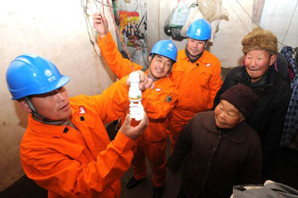 圖一:潘集供電公司“三輪車服務隊”為空巢老人更換老舊線路和節能燈