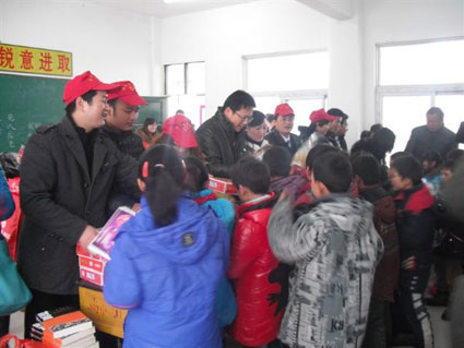 圖一:蔣美義(左一)和同事們一起向農村小學捐書本文具