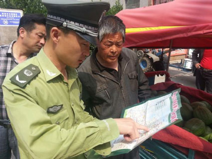 圖:執(zhí)法人員給瓜農(nóng)講解新版西瓜地圖銷售點布局 (照片由田家庵區(qū)城管行政執(zhí)法局提供)