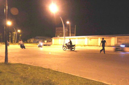 “是改裝摩托車。”潛伏民警說完這句話便立刻帶記者轉移到南緯一路路旁的矮樹叢里,記者和民警剛蹲下身子,一群閃著耀眼大燈的摩托車便從記者的身旁飛馳而過,這些摩托車駕駛人還邊跑邊相互大聲說笑,做出“提把、蛇形繞彎”等危險動作。記者粗略數了一下,從記者身旁跑過的摩托車大約有14輛,其中多輛摩托車的車上還載有長發飄飄的女孩,且這些女孩都沒有戴安全頭盔。