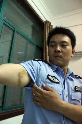圖二:民警在抓捕飆車黨過程中負傷