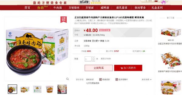 當天零點以后,記者再次登錄淘寶網,看到這些網站上的客服依然在線,為淮南牛肉湯,小二們蠻拼的!公開數據顯示,近一個月全國各地的網民通過淘寶網和京東商城等網絡銷售平臺,至少購走了3000箱淮南牛肉湯,淮南牛肉湯的銷量位列牛肉湯方便食品類首位。