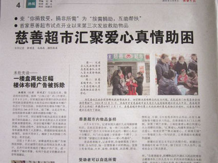 慈善超市匯聚真情匯聚愛。2015年2月9日,早報熱線以《慈善超市匯聚愛心真情助困》為題,報道了淮南市首家慈善超市向救助對象發放物品的情況。為完善社區社會弱勢群體救助幫扶體系,切實解決困難群眾的生活問題,在民政部門和慈善協會的指導幫助下,2014年12月31日,淮南市首家慈善超市在大通區九龍崗鎮新建社區試點開業。慈善超市改以往“你捐我受,捐非所需”為“按需捐助,互助幫扶”,體現了“以人為本”的理念。