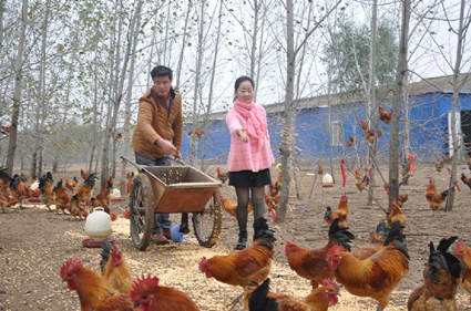 他的決定遭到了不少親友的反對(duì),有的甚至對(duì)他冷嘲熱諷,可孫倫洋卻說(shuō),現(xiàn)在圖的是眼前的利益,對(duì)子孫來(lái)說(shuō)無(wú)益,而國(guó)家在環(huán)境保護(hù)方面力度逐年加強(qiáng),投資的項(xiàng)目早晚要關(guān)停。晚停不如早停,早做轉(zhuǎn)型的準(zhǔn)備。投資的錢(qián)打了水漂,購(gòu)買(mǎi)的機(jī)械設(shè)備閑置在家,該如何轉(zhuǎn)型呢?孫倫洋轉(zhuǎn)而一想,自己不是還有80畝荒地嗎,不如發(fā)展特色農(nóng)業(yè)。他首先在荒地里開(kāi)辟了兩畝油菜,搭起了葡萄架,但總不見(jiàn)生長(zhǎng),于是請(qǐng)教農(nóng)技專(zhuān)家,發(fā)現(xiàn)荒地的土主要成分是細(xì)灰,沒(méi)有“營(yíng)養(yǎng)”。于是,孫倫洋又開(kāi)始搗鼓起土雞養(yǎng)殖,利用土雞糞便化成土壤的養(yǎng)料。他引進(jìn)了當(dāng)?shù)氐穆辄S雞和“淮南王”兩個(gè)品種3000余只,在荒地上進(jìn)行散養(yǎng)!皠e人用的都是飼料,出欄快,但肉質(zhì)不好吃,我就不這樣做!睂O倫洋就地取材,在當(dāng)?shù)厥召?gòu)玉米小麥作為飼料,平時(shí)有空他就趕雞上樹(shù),讓土雞充分地活動(dòng)起來(lái)。別人養(yǎng)的雞半年出欄,而孫倫洋養(yǎng)的雞卻至少要等到一年半以上才能出欄,每只雞平均4斤多重,肉質(zhì)鮮美,在市場(chǎng)上供不應(yīng)求。