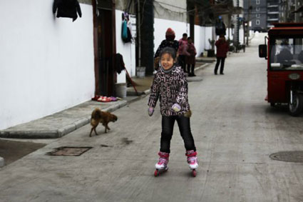 圖一:孩子在新鋪的水泥路面上玩起了輪滑