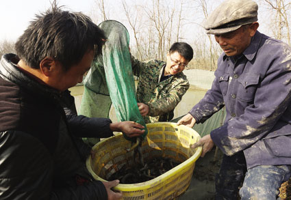 12月26日上午,鳳臺縣桂集鎮白塘村村民繆先生正在自家參股的合作社泥塘里收獲養殖的泥鰍。據了解,鳳臺水富里水產養殖專業合作社聯合周邊20多戶農戶一起養殖泥鰍,鎮里數百人依靠泥鰍致富。繆先生告訴記者,冬季是泥鰍市場的空白期,東亞市場上泥鰍供不應求,他們合作社每年冬季出口泥鰍近6萬斤,熱銷韓國、日本,填補市場空白,出口的泥鰍價格均高于本地市場價,高達18-20元每斤。