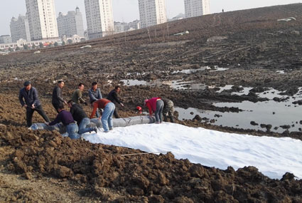 2015年12月31日下午,淮河早報記者來到朝陽東路和田大路交口處“五一”公園的施工現場。鏟車和推土機等機器正在作業,現場地形已經有了錯落有致的感覺,水景片區一目了然。空曠的場地讓人心胸為之開闊,空氣也似乎清爽了許多。在“公園”的東北部,是水景片區的施工處,一條長長的白色帶狀物正在鋪設,遠看好似白雪皚皚。施工方青島柏高市政園林建設集團有限公司現場施工負責人孫齊友向記者介紹,這是防水毯鋪設,涉及整個水景區,防水毯兩層之間夾著膨脹土,具有保水儲水功能,防止水滲入地下。孫齊友說,“五一”公園從2015年12月上旬開工建設,每天投入挖掘機、推土機等大型機械幾十輛,由于天氣情況比較理想,目前已經完成廣告拆除、建筑垃圾清運,池塘清淤等工作,工程進展順利,已完成整個工程量的40%,為了盡快把公園建成,施工方基本沒有休息。由于整個施工是按照規劃根據地形需要進行,節省了投資,待前期工作完全結束后,就可以根據天氣條件栽種香樟等多種植物,進一步完成園區道路和健身廣場的建設。考慮市民的需要,園區內還將設置一個公廁。