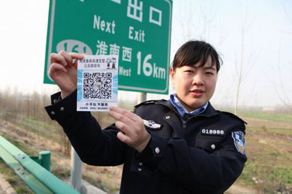 淮河早報(bào)、淮南網(wǎng)記者了解到,這幾天,高速交警為了推廣微信公眾號(hào),在警車、執(zhí)法站、服務(wù)區(qū)都粘貼了印有二維碼的貼紙,方便過(guò)往駕乘人員掃描關(guān)注。并且,在淮南轄區(qū)的高速路面的護(hù)欄上,交警每隔100米張貼了一張,當(dāng)發(fā)生交通事故后,駕駛?cè)丝梢跃徒鼟呙桕P(guān)注,了解“快處快撤”的處理流程。