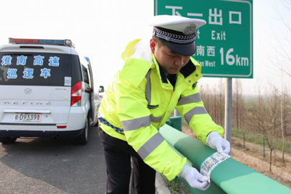 圖二:交警將標(biāo)有高速大隊(duì)微信公眾號(hào)的宣傳紙張貼在護(hù)欄上