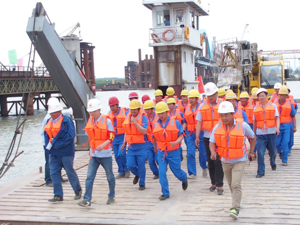 演練指揮長介紹,大橋施工,汛情影響首當(dāng)其沖,尤其今年又有超強(qiáng)厄爾尼諾現(xiàn)象的影響,防汛形勢更加嚴(yán)峻。防汛撤離演練堅持把保障施工人員生命和身體健康放在首位,加強(qiáng)應(yīng)急預(yù)案救援人員的安全防護(hù),最大程度地減少汛情造成的人員傷亡和財產(chǎn)損失。本次演練旨在提高施工人員的應(yīng)急搶險救援能力和現(xiàn)場處置突發(fā)自然災(zāi)害的能力,未雨綢繆,確保汛期安全。