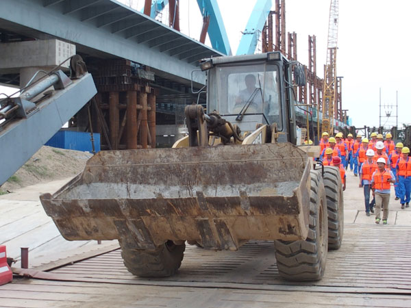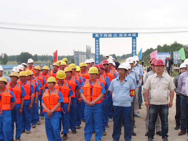孔李淮河大橋是淮南市重點工程,防汛演練由承建方中鐵六局集團(tuán)孔李大橋項目部組織實施,演練地點位于大橋工程跨南大堤內(nèi)129#墩至136#墩之間。演練模擬汛期來臨,淮河上游及項目所在地區(qū)普降暴雨引起淮河水位上漲即將達(dá)到20.5米的警戒水位,威脅到施工人員生命安全和財產(chǎn)安全,項目部立即啟動應(yīng)急程序,進(jìn)行人員、設(shè)備轉(zhuǎn)移。
