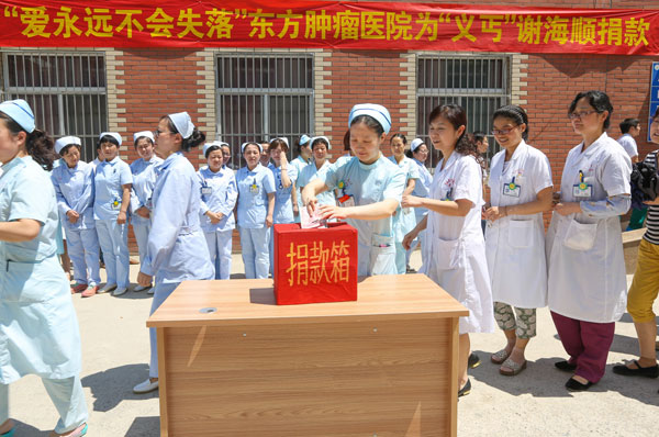謝海順入院后,淮南東方醫院集團立即啟動特困患者救助金,于16日上午將救助金送到他女兒手中。東方腫瘤醫院以“大愛無疆,愛永遠不會失落”為主題在全院為“義丐”謝海順進行了募捐,群眾、患者及家屬、醫務人員得知是為謝海順捐款,紛紛獻上自己的一份愛心,有些醫護人員因工作不能離開崗位,便委托同事將善款送到募捐現場。17日下午,淮南東方醫院集團總院也為謝海順進行了一場愛心捐款活動,大家所捐獻的一分一毫、一點一滴都蘊含著無價的愛心。淮南東方醫院集團總院、東方腫瘤醫院以及集團各分院為謝海順共募捐71203元,這些善款將用于謝海順的后期治療,他的三個女兒都感動的熱淚盈眶。