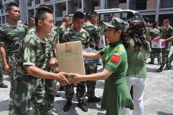 圖二為慰問人員將慰問品送到戰士們的手中。