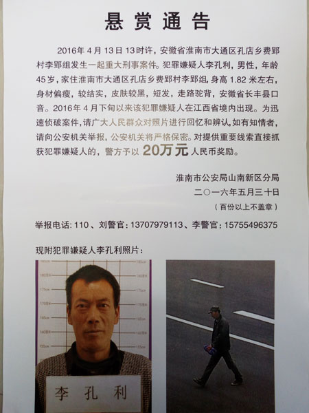 “李孔利有很強(qiáng)的反偵查意識(shí),案發(fā)前他每年都養(yǎng)鴨子,為了省錢,他會(huì)帶著鴨子到野外去放兩個(gè)多月,自己在外面隨便搭個(gè)棚子吃住生活。他曾經(jīng)干過(guò)打獵、盜墓之事!”高坤表示,為了追蹤李孔利,淮南警方出動(dòng)了200余人次進(jìn)行偵查,印發(fā)了百萬(wàn)份懸賞通告,并利用網(wǎng)絡(luò)微信、電視報(bào)紙等各種媒介結(jié)合傳統(tǒng)工作方式進(jìn)行反復(fù)宣傳。由于案發(fā)地較為偏遠(yuǎn),視頻探頭覆蓋少,警方?jīng)]能捕捉到李孔利的身影。警方在汽車站、火車站、各個(gè)交通路口,布置了層層警力進(jìn)行圍追堵截,可李孔利就像人間蒸發(fā)一樣,始終沒(méi)發(fā)現(xiàn)其蹤跡。