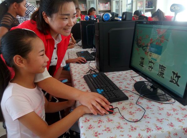 10歲的蘇可是武廟小學的三年級學生,父母在蘇州打工,每天下午她都會準時由爺爺奶奶接送到這里。“上午在家陪爺爺奶奶,下午他們下地干活,我就來這里和小朋友們一起過暑假,在這做暑假作業,不但有老師指導,還可以和村上其他小伙伴一起看書、玩電腦,十分開心。”