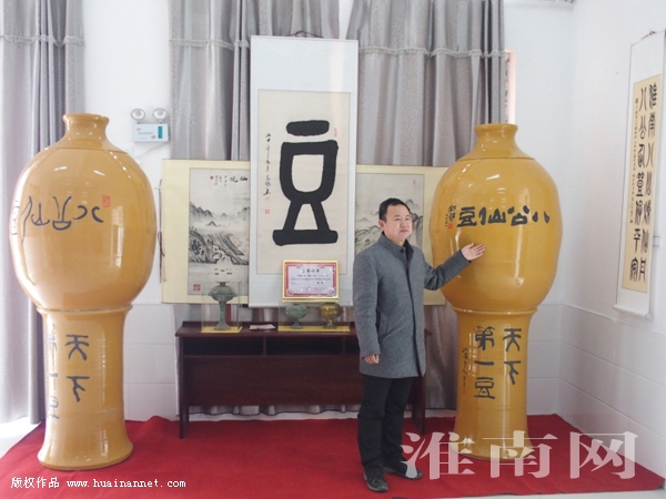 李佩樂告訴淮河早報、淮南網(wǎng)記者,他一直在收集有關(guān)大豆文化的實物和書畫,這也是豐富和延伸淮南豆腐文化內(nèi)涵,把“淮南豆腐文化”這張名片擦得更鮮亮。在有了一定的收藏基礎(chǔ)后,他就想能有個“大器”、“重器”,作為“鎮(zhèn)館之寶”。基于這樣的想法,他闡述理念請人設(shè)計出“豆”器的小樣,上書“八公仙豆”、“天下第一豆”燒制成工藝品擺件。而這個大型“豆”器則是放大制作的,全國就此一對。