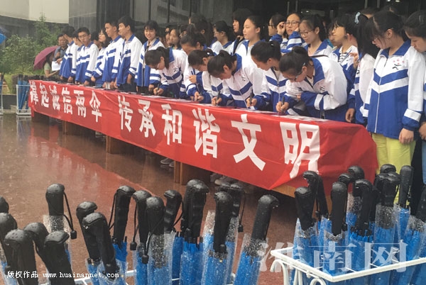 “我莊嚴宣誓:誠實守信,立身之本……嚴以律己,樹立和維護淮南的誠信形象,爭做誠信少年。”6月10日上午,500把“誠信雨傘”擺放進淮南一中校內,近百名高中生作誠信宣誓并在信守承諾條幅上簽下自己的名字。與此同時,全市多家銀行業金融機構派駐工作人員在新世界購物中心門前開展宣傳活動,讓市民了解“誠信便民傘”這一活動內容。