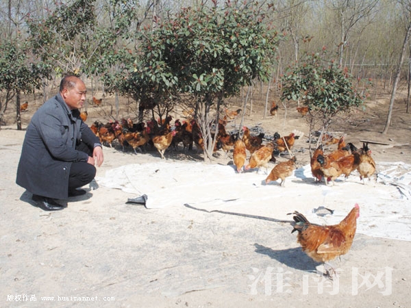 圖:綠馨園公司負責人陳鵬在查看林下散養的淮南麻黃雞
